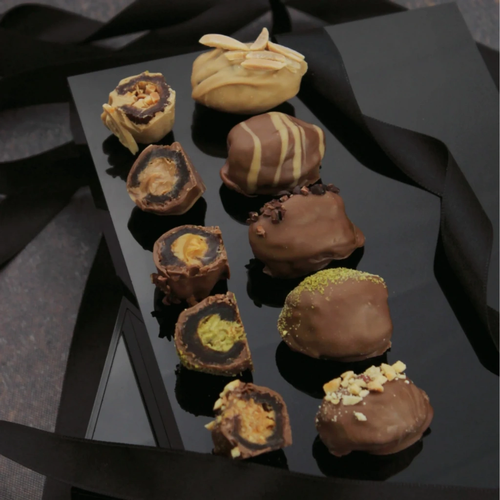 Özel dolgulu ve çikolata kaplı hurmalar.