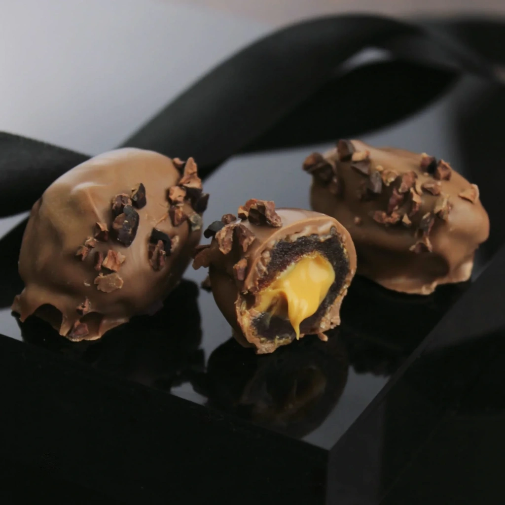 Özel dolgulu ve çikolata kaplı hurmalar.