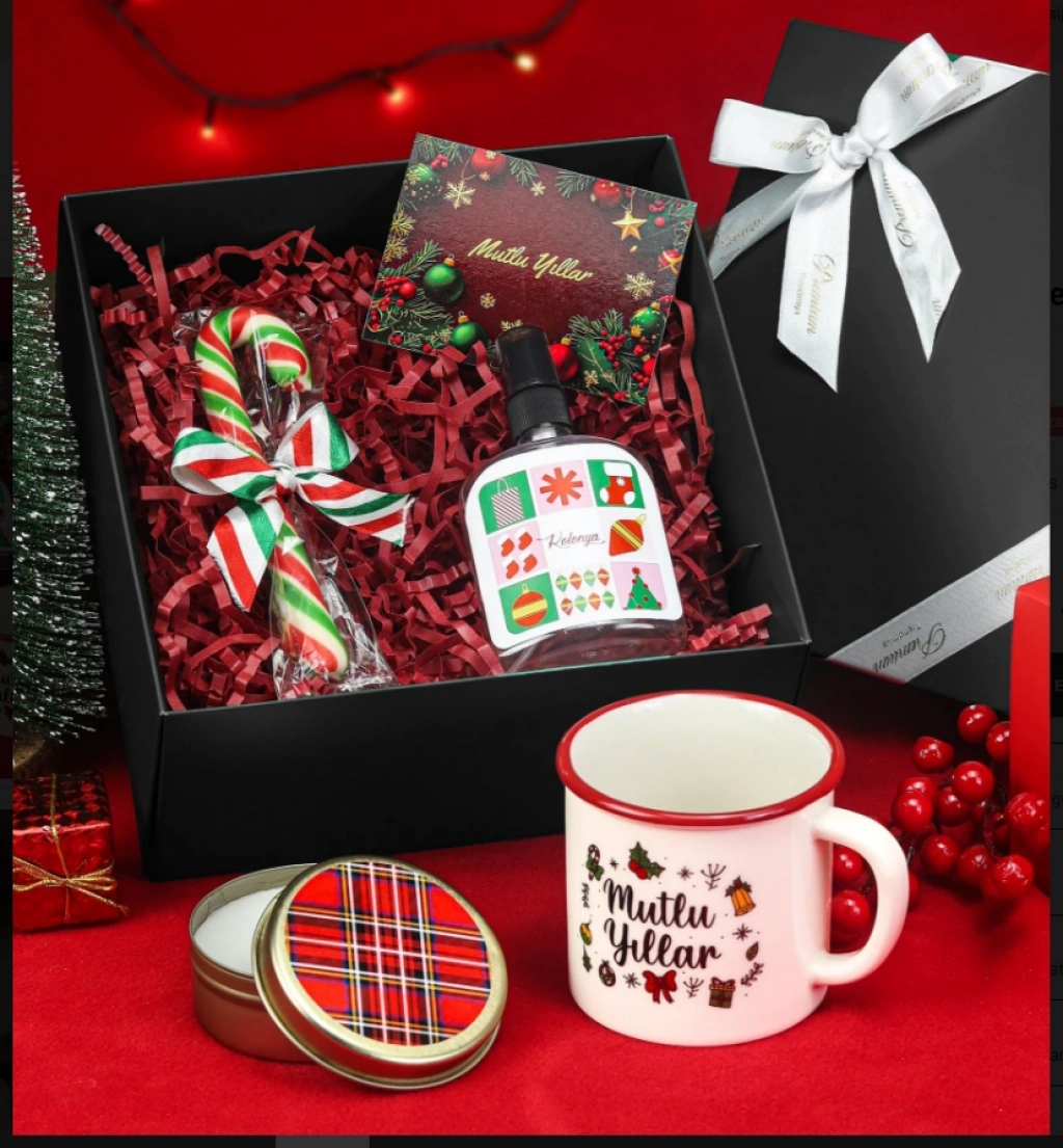 Set İçeriği: 1 Adet Mutlu Yıllar Vintage Kupa & 1 Adet Ekose Mum & 1 Adet Pet Şişe 100ml Kolonya & 1 Adet Baston Şeker