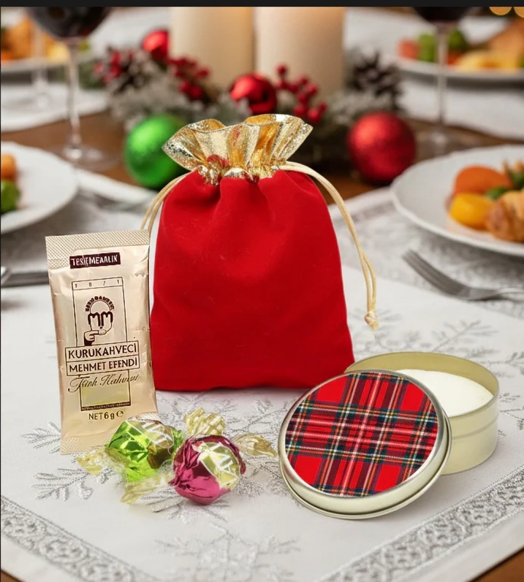 Set içeriği: 1 Adet Kırmızı Kese & 2 Adet Lavi Çikolata & 1 Adet Mehmet Efendi Türk Kahvesi & 1 Adet Ekose Desenli Metal Kutulu Mum